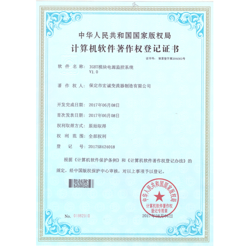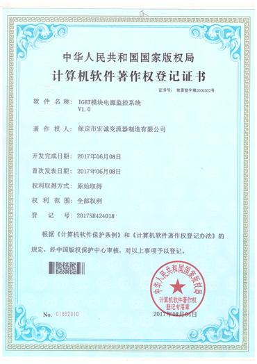 • 計(jì)算機(jī)軟件注冊(cè)權(quán)登記證書(shū)——IGBT模塊電源監(jiān)控系統(tǒng)V1.0