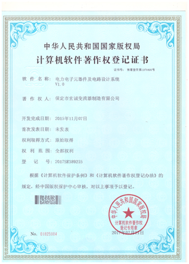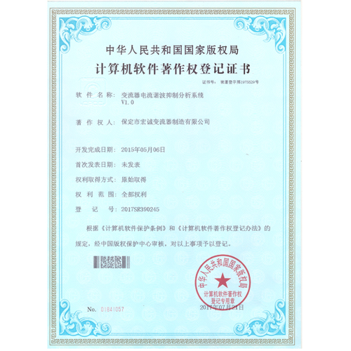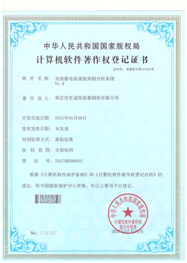 • 計(jì)算機(jī)軟件注冊(cè)權(quán)登記證書(shū)——變流器電流諧波抑制分析系統(tǒng)V1.0