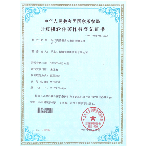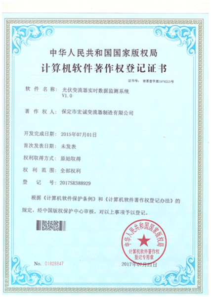 • 計(jì)算機(jī)軟件注冊(cè)權(quán)登記證書(shū)——光伏變流器實(shí)時(shí)數(shù)據(jù)檢測(cè)系統(tǒng)V1.0
