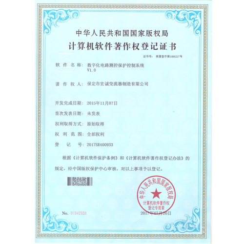 • 計(jì)算機(jī)軟件注冊(cè)權(quán)登記證書(shū)——數(shù)字化電路測(cè)控保護(hù)控制系統(tǒng)V1.0