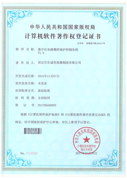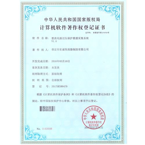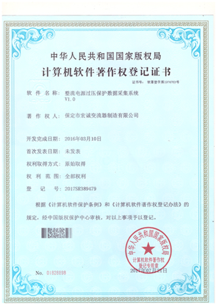 • 計(jì)算機(jī)軟件注冊(cè)權(quán)登記證書(shū)——整流電源過(guò)壓保護(hù)數(shù)據(jù)采集系統(tǒng)V1.0