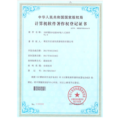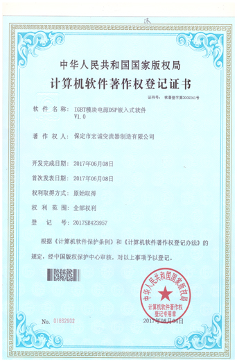 • 計(jì)算機(jī)軟件注冊(cè)權(quán)登記證書(shū)——IGBT模塊電源DSP嵌入式軟件V1.0